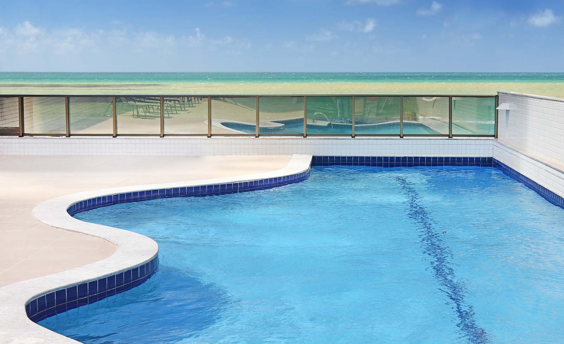 Piscina ao ar livre com o Atlântico como pano de fundo — o lugar ideal para pausar entre compromissos, passeios e dias de praia, sem sair do condomínio.