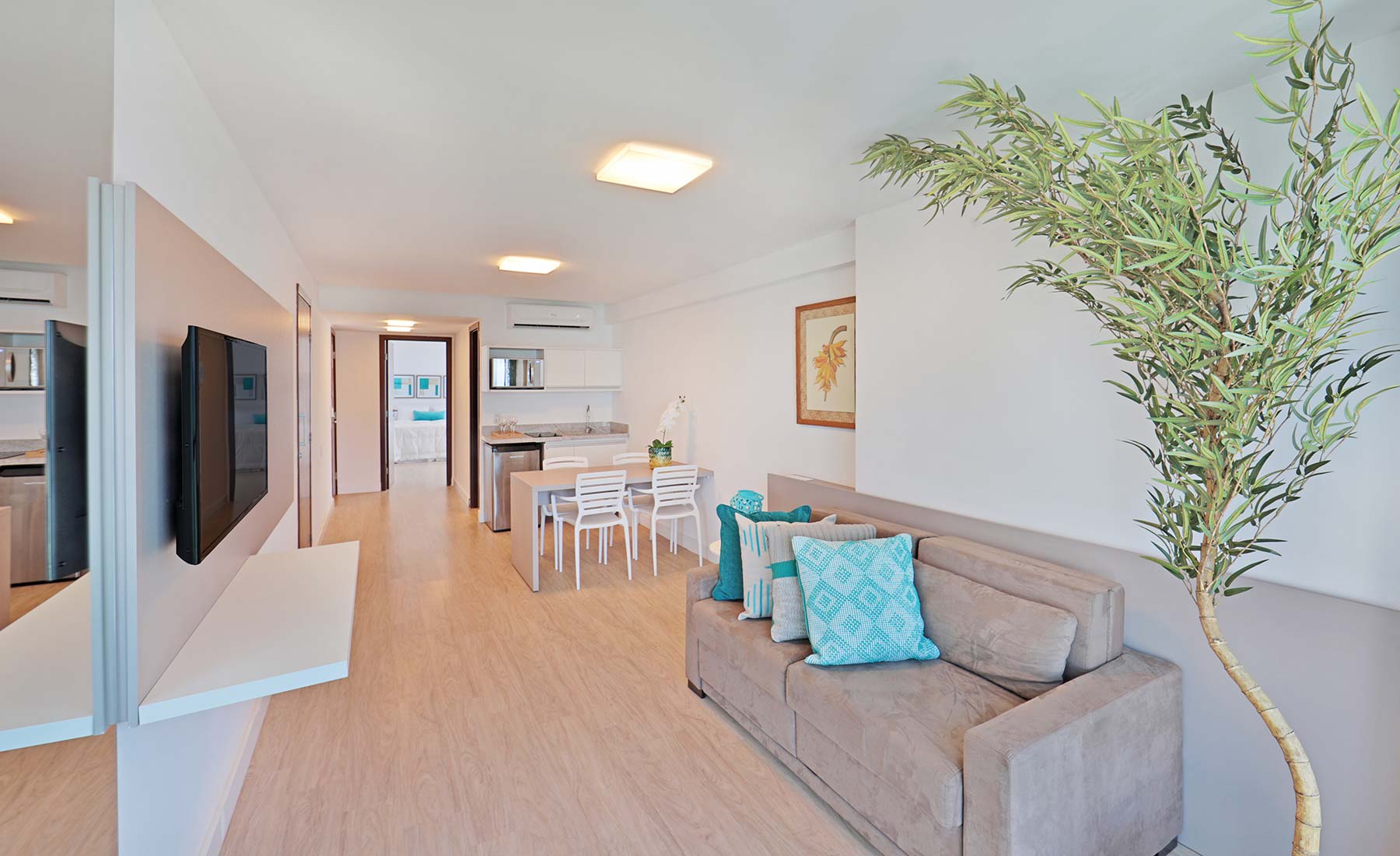 30 m² con distribución flexible: dos individuales y una king, vista al mar y TV LED 47". Cocina compacta con microondas, sofá, cafetera y vinoteca refrigerada, además de caja fuerte y baño privado — muy adecuado para familia o amigos.