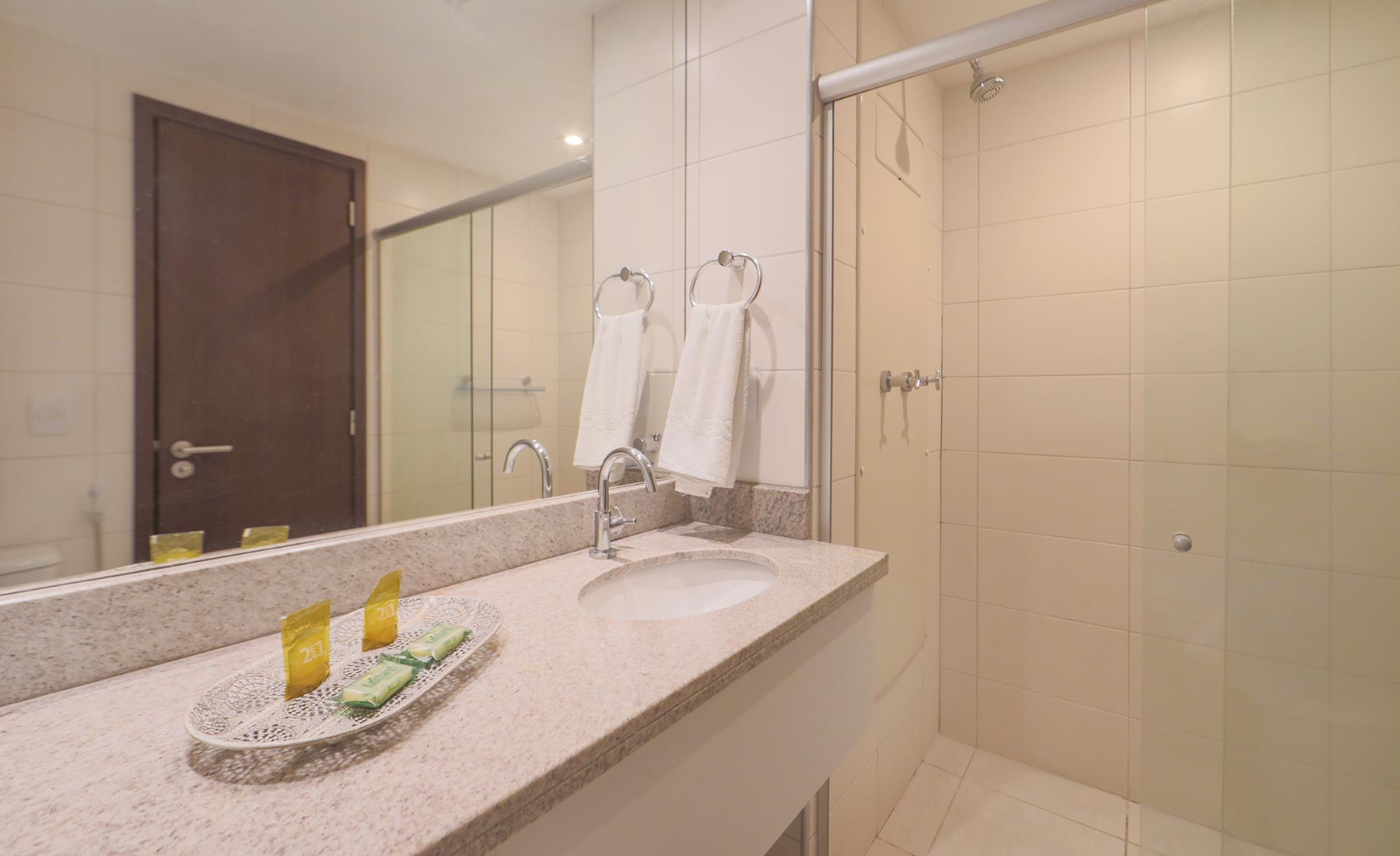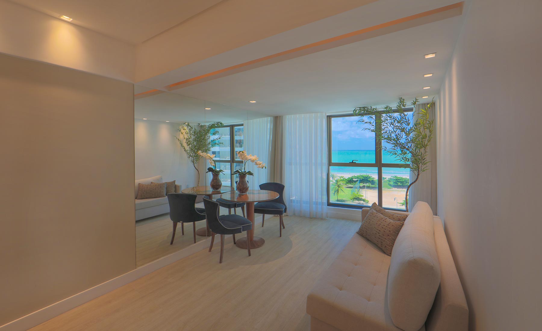 Plano compacto y confortable: cama queen, sofá cama y vista directa al mar. TV, Wi‑Fi, minibar y cortinas blackout. Baño privado con secador y amenities — lo esencial para una estadía ligera en Boa Viagem.